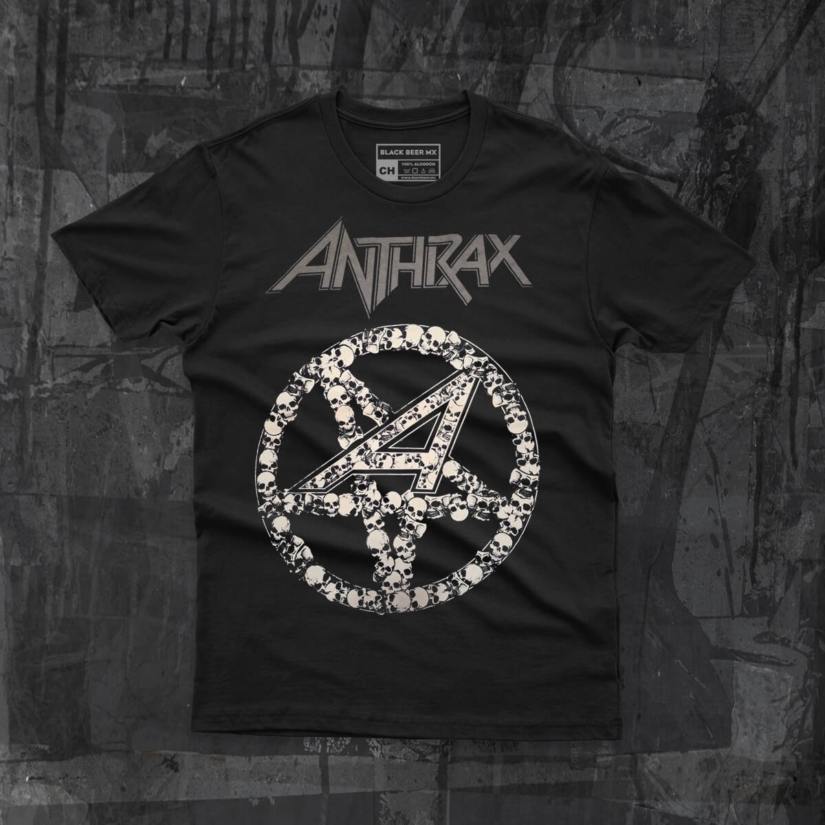 Su estampado muestra el legendario diseño del Pentagram Skull, símbolo que conecta con la energía agresiva y la rebeldía de Anthrax. Perfecta para conciertos, festivales o como parte de tu estilo streetwear rockero, esta camiseta te permite llevar el poder del metal en cada paso.