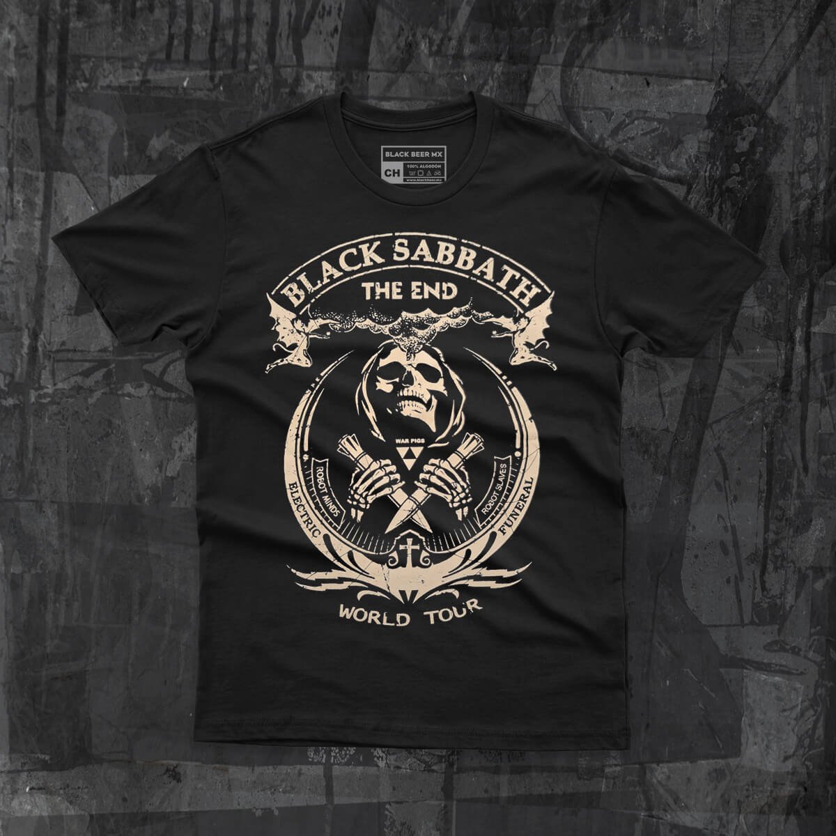 Playera Black Sabbath The End World Tour, 100% algodón suave, estampado duradero y diseño streetwear de rock auténtico. Ideal para fans de la banda.